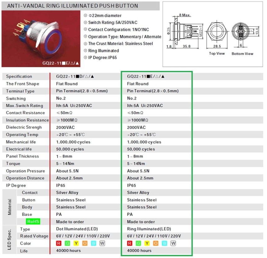 GQ22-11E/R/12V 22파이 레드LED 방수 메탈 푸쉬 버튼 스위치 PUSH BUTTON ONPOW | 파츠바다 - 모든 전자부품의 정답
